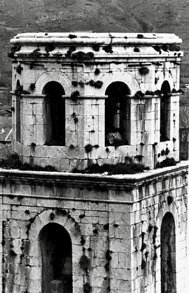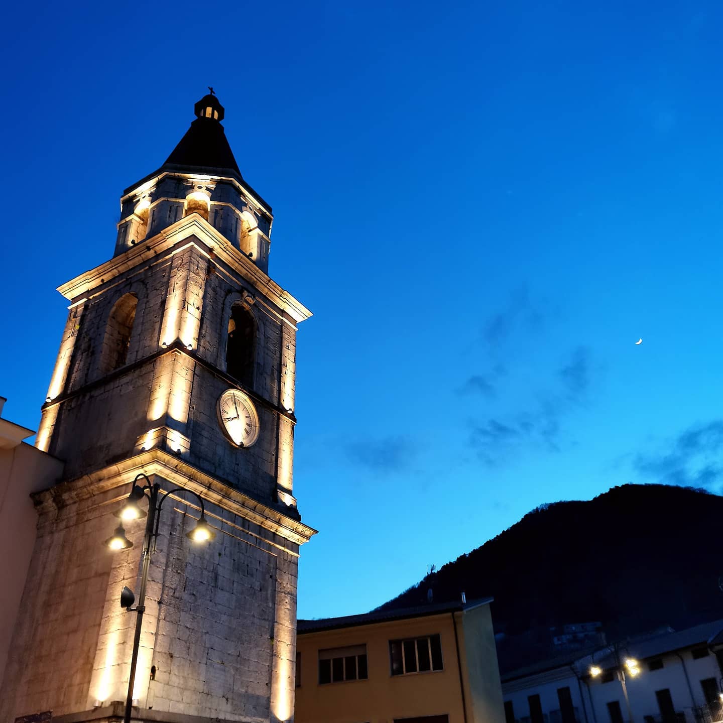Addossato alla Chiesa Madre è il campanile. Il primo risale al 1500-1520 ed è di pietre grezze, l’attuale, in blocchi di pietra scalpellata ricavati dal monte Maroia, riveste il vecchio, e risale al 1754. In basso presenta un cancello di ferro che dà accesso alle campane attraverso una scala a chiocciola. L’iscrizione sul cancello dice: “Nel sindacato di L. Masucci 1905”.