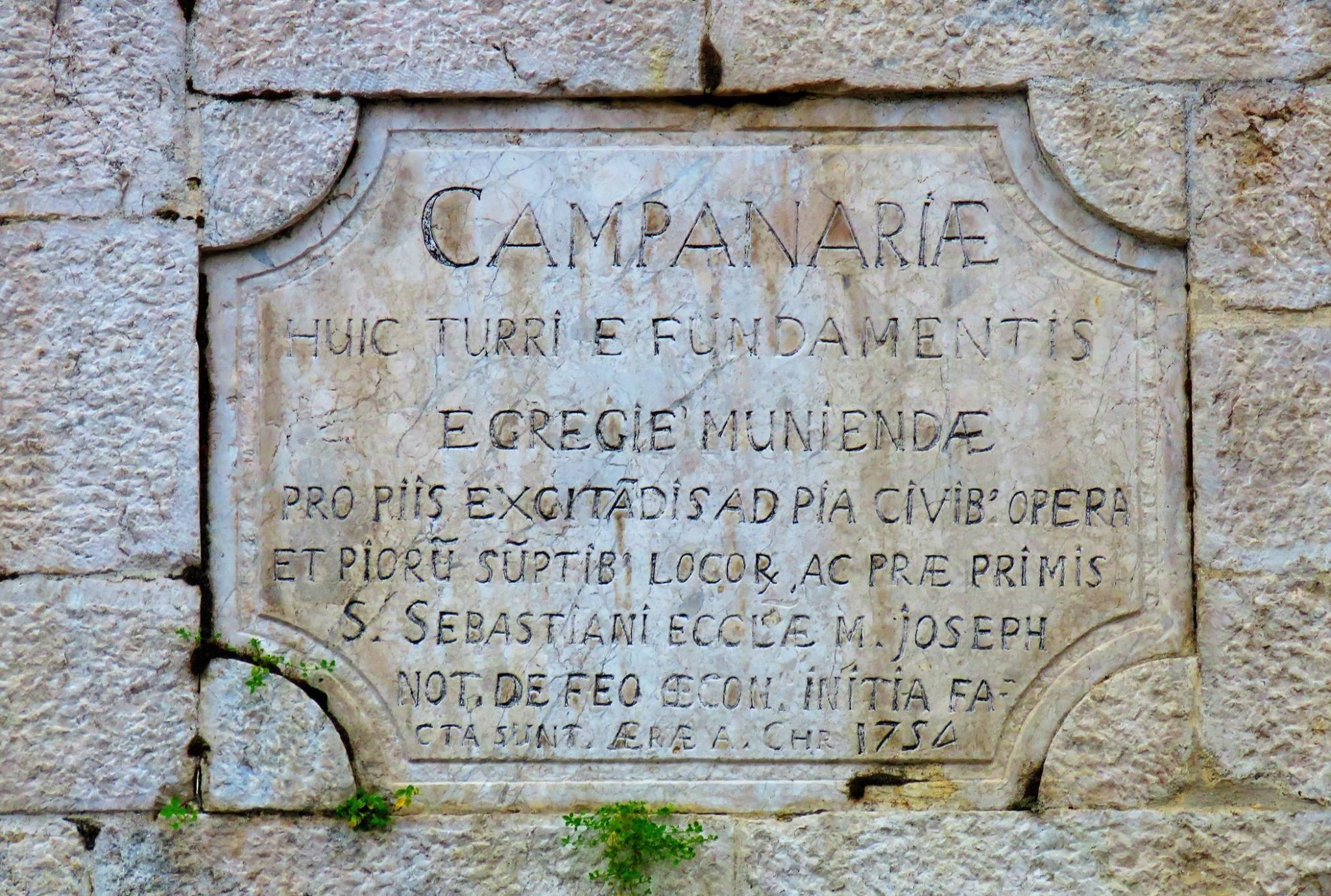 CAMPANARIAE HUIC TURRI E FUNDAMENTIS EGREGIE MUNIENDAE PRO PIIS EX CITADIS AD PIA CIVIB: OPERA ET PIORU SURTIB LOCOR AC PRAE PRIMIS S. SEBASTIANI ECCLAE M. JOSEPH NOT. DE FEO… CON INITIA FACTA SUNT A.R.A.A CHR 1754.